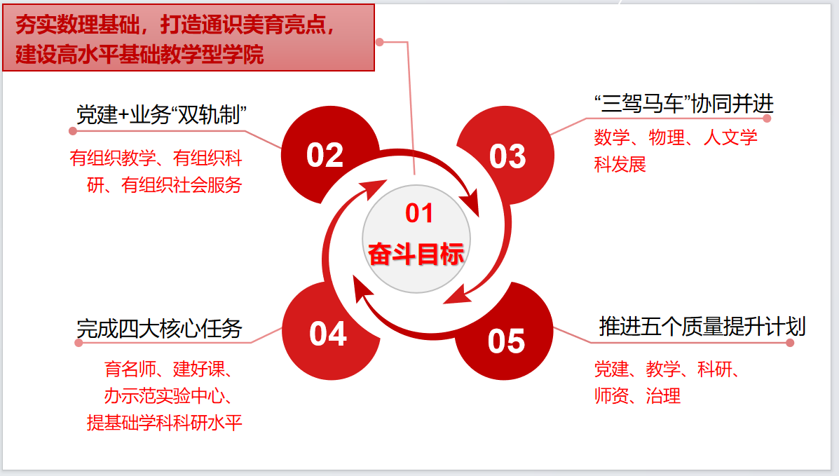 副院长吉文斌对暑期教改调研工作做了总结,并对开学阶段教学工作做了布置。他结合学院班子的主题教育调研成果,作了题为“如何加强高水平基础教学型学院建设的思考”的报告。报告深入分析pp电子游戏平台官网在建设高水平基础教学型学院过程中的痛点问题、难点问题、弱点问题、堵点问题等,根据学院班子在主题教育期间的调研成果,提出“12345”的学院建设思路:“1”是实现一个奋斗目标,即夯实数理基础,打造通识美育亮点,建设高水平基础教学型学院;“2”是推进“党建+业务”的“双轨制”建设,促进有组织教学、有组织科研、有组织社会服务;“3”是“三驾马车”协同并进,推进数学、物理、人文三个学科高质量发展;“4”是落实四大核心任务,即做好育名师、建好课、办示范实验中心、提基础学科科研水平等四方面重点工作;“5”是实施五个质量提升计划,即党建质量提升计划、教育教学质量提升计划、科研水平提升计划、师资队伍提升计划、治理能力提升计划。吉文斌指出,pp电子游戏平台官网正处在推进高质量发展的重要机遇期,全体文理人要继续弘扬务实的文理之风,努力办好开放的pp电子游戏平台官网,齐心走出奋进的文理之路,为创造pp电子游戏平台官网更美好的明天而协同努力!