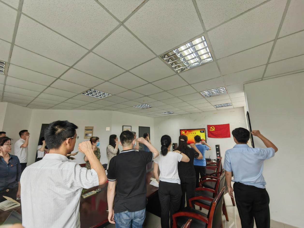 (在直属党支部书记带领下,党员们重温了入党誓词,并齐声歌唱“没有共产党,就没有新中国”)