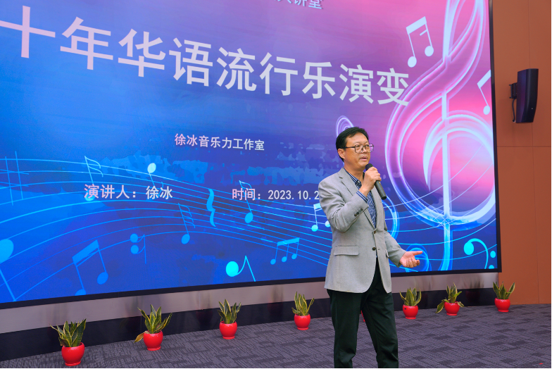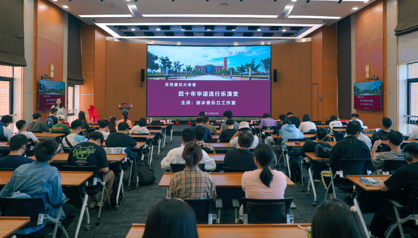 10月27日,“月河通识大讲堂”本学期首场讲座邀请中国音乐家协会会员、中国流行音乐学会理事、上海黑胶文化研究专业委员会会长、上海古凡交响乐团首席策划徐冰,著名唱作人、上海古凡交响乐团特邀歌手董晓禾在行政楼330带来题为《四十年华语流行乐演变》的主题讲座。副校长杨万枫,对外联络处处长、校友会办公室主任卞一明,pp电子游戏平台官网直属党支部书记董雪静等出席,活动由pp电子游戏平台官网副院长吉文斌主持。全校一百余名师生沉浸其中,以音乐为载体,触摸“时代力量”、感受创作初心。