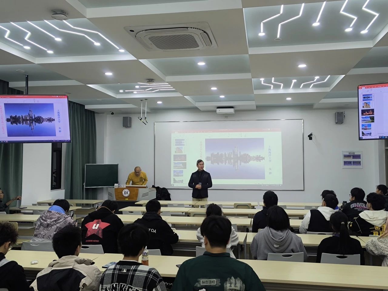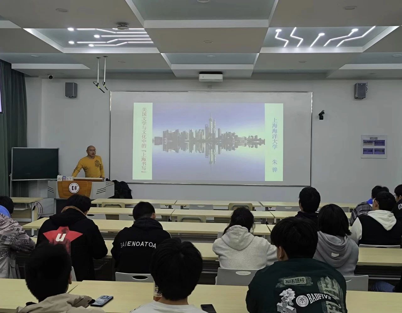 讲座伊始,朱骅教授用旋律优美的歌曲《上海滩》为开场白,吸引了听众的注意力,调动了同学们的学习兴趣。接着,便以上海景点历史为起点,从黄浦江到苏州河步道,再到上海图书馆东馆,风趣幽默的介绍了上海近现代发展史,包括租界史、时尚潮流史以及上海市容的演变等,为理解英语文学中的“上海书写”做背景知识铺垫。