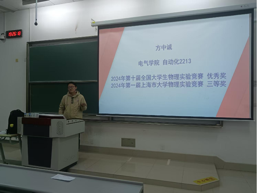 会上杨俊伟老师对2025年全国大学生物理实验竞赛(创新)选拔赛暨上海电机学院第六届大学生实验科技作品创新竞赛的比赛目的、比赛题目、赛事安排、竞赛流程、指导教师、竞赛评奖办法、注意事项、往届比赛组织和获奖情况进行了解读。竞赛团队的赵华老师鼓励学生勇于面对挑战、坚持参加比赛和团队合作等方面进行了补充说明;竞赛团队的金华老师对选择参赛题目、AI使用规范和试验仪器改装与使用等方面补充说明。之后,历届竞赛获奖代表分享了各自的备赛经验。电气2311班王沙沙获得2024年国赛二等奖和上海市二等奖、材料2311班刘磊获得2024年国赛二等奖和上海市二等奖、电气2212班张宸获得2024年国赛优秀奖和上海市三等奖、自动化2213班方中诚获得2024年国赛优秀奖和上海市三等奖、封装2311班孙静轩获得2024年国赛优秀奖和上海市三等奖。几位同学从作品的准备、PPT制作、视频录制、小组分工、实验安排、个人成长与收获等方面分享了自己参赛的心得体会。本次活动使得同学们对于大学物理实验竞赛有了全面的了解和认识,激发了大家参与大学物理实验竞赛的热情和积极性,为后续稳步推进这项赛事的竞赛工作奠定了良好基础。