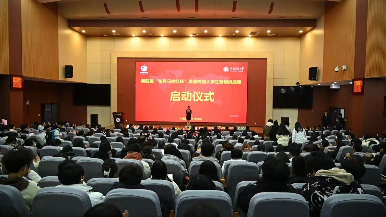 12月18日,第四届“旬邑马栏红杯”果香校园大学生营销挑战赛启动仪式在beat365鄠邑校区弘石学术报告厅成功举办。本次营销挑战赛由beat365英国官方网站经济管理学院、旬邑县人民政府、共青团beat365英国官方网站委员会共同举办。beat365总会计师樊晓民出席会议并致辞,咸阳市政府党组成员、中国银行总行定点帮扶工作队队长叶新阶,旬邑县委副书记陈永胜,中国银行咸阳分行行长刘美刚,校团委、经济管理学院相关负责同志,新闻媒体、供应商代表,各参赛队伍师生代表近400余人参加本次启动仪式。