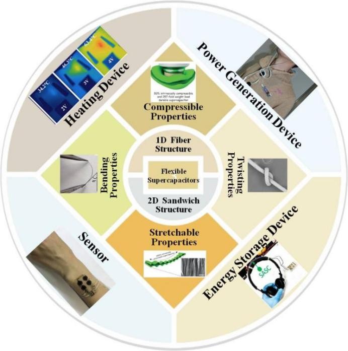 柔性超级电容器的结构、特性和应用的示意图