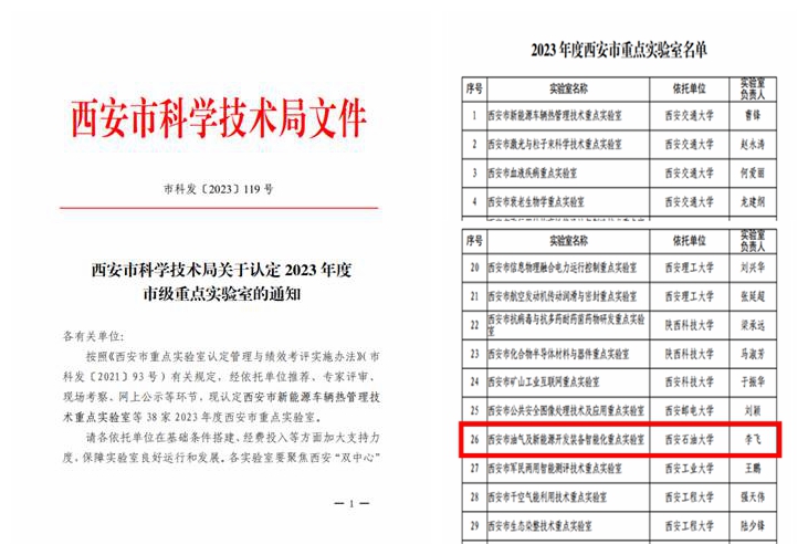 近日,西安市科技局发布《西安市科学技术局关于认定2023年度市级重点实验室的通知》,beat365电子工程学院李飞教授牵头的“西安市油气及新能源开发装备智能化重点实验室”通过认定,本次共38家实验室通过认定。