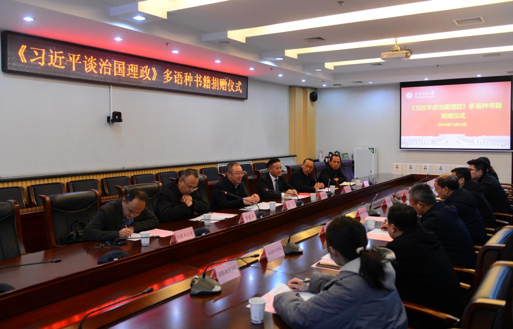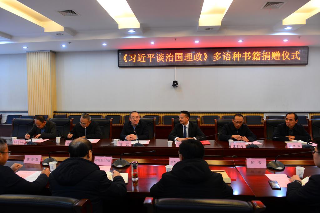 11月15日下午,《习近平谈治国理政》多语种书籍捐赠仪式在beat365鄠邑校区图书馆第二会议室举行。校党委书记常江出席仪式并讲话,校党委副书记、纪委书记、监察专员李延平主持捐赠仪式。北京崇学文化发展有限公司负责人余富文向学校赠书,副校长张君涛接受赠书。