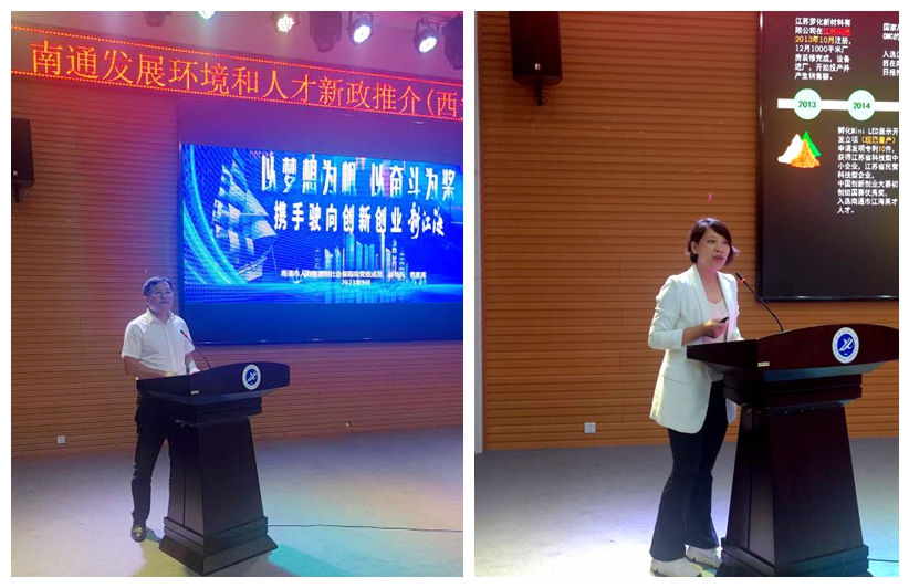 曹星晖代表人力资源和社会保障局作“南通发展环境和人才政策”推介,从产业提质扩量、交通枢纽建设、营商环境优化、城市品质提升、生活品质提升等方面介绍了南通市经济发展情况和人才新政。江苏罗化新材料有限公司董事长罗雪方作为企业代表,结合自身创业经历分享了南通市优质的创业环境和引才留才举措。