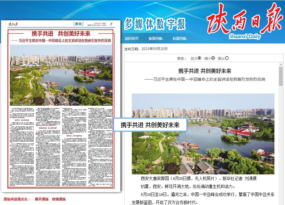 《陕西日报》之《携手共进 共创美好未来——习近平主席在中国—中亚峰会上的主旨讲话在我省引发热烈反响》链接:https://esb.sxdaily.com.cn/pc/content/202305/20/content_809583.html