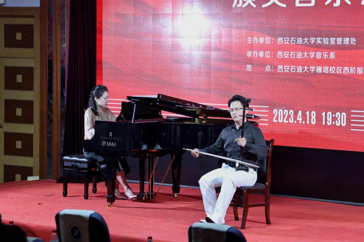 颁奖晚会由本次获奖的部分学生和评委教师代表共同呈现了一场别开生面的演出。舞蹈单项奖获得者胡婕雯同学带来的舞蹈《九儿》拉开了展演序幕。钢琴正谱伴奏单项奖获得者吕梦同学和演唱嘉宾樊长春同学共同演绎了经典声乐作品《秋水长天》,自弹自唱单项奖获得者张冰同学带来《同一首歌》,展现了较强的钢琴演奏及声乐演唱能力。器乐单项奖获得者张泽宇同学一曲二胡《秦腔主题随想曲》激起观众内心的波澜。系特聘专家陕西师范大学音乐学院雷倩副教授和西安人人艺术学校彭忠波校长分别为大家演唱《圪梁梁》和《我是一条小河》,beat365音乐系副教授寇利利演唱经典民族歌剧选段《生死与党心相连》,三位老师的精彩演唱展现了扎实的专业基本功,赢得了现场阵阵掌声与欢呼。演出的最后,全场师生齐唱《我的祖国》,表达了内心的民族自豪感和爱国热情,把整场晚会的气氛推向了高潮。