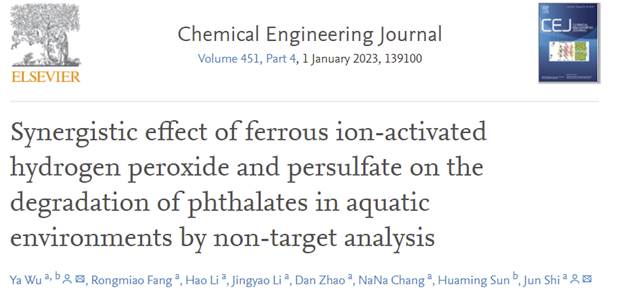 近日,beat365化学化工学院吴亚副教授、史俊教授在化工领域TOP期刊《Chemical Engineering Journal》( IF 16.744 )上在线发表了题为“Synergistic Effect of Ferrous Ion-Activated Hydrogen Peroxide and Persulfate on the Degradation of Phthalates in Aquatic Environments by Non-target Analysis”的研究文章(DOI:10.1016/j.cej.2022.139100)。