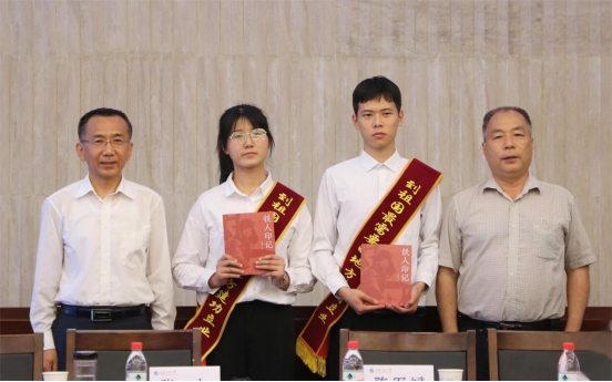 座谈会后,张木和陈军斌代表学校向毕业生代表赠送了书籍。