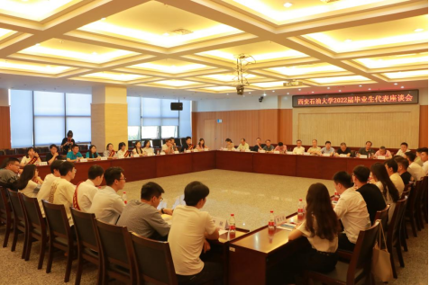 6月24日上午,2022届毕业生代表座谈会在beat365鄠邑校区图书馆第一会议室召开。校党委副书记张木、副校长陈军斌,党政办、学工部、研工部、保卫处、校团委、教务处、实验室管理处、后勤处、高评中心、图书馆等部门负责人以及来自各学院的2022届本科生、研究生代表参加了座谈会。