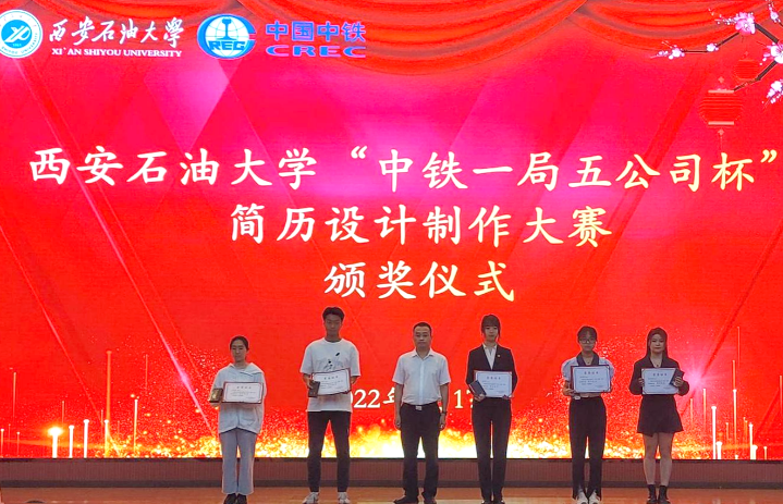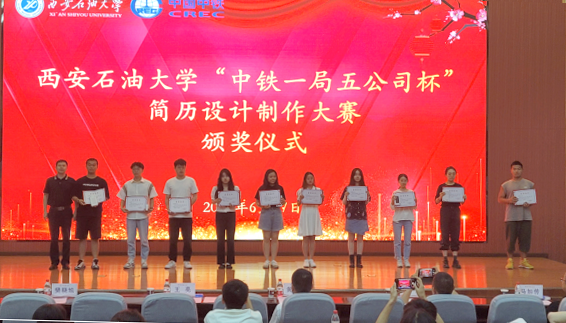 黄晓春宣读了“中铁一局五公司杯”简历设计制作大赛表彰决定,并为谢仁阿依等5名同学颁发了“设计之星”奖。相关部门负责人为获奖单位和个人颁发了优秀组织奖、优秀指导教师奖、最佳创意奖和优秀奖。