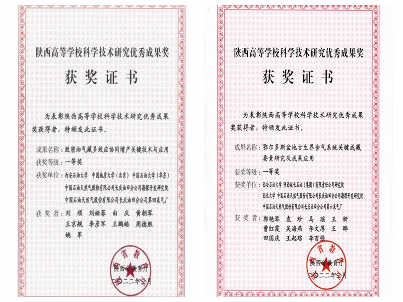 刘顺教授团队主持完成的“致密油气藏多效应协同增产关键技术与应用”和郭艳琴教授团队主持完成的“鄂尔多斯盆地古生界含气系统关键成藏要素研究及成果应用”两项成果荣获陕西高等学校科学技术研究优秀成果奖一等奖。
