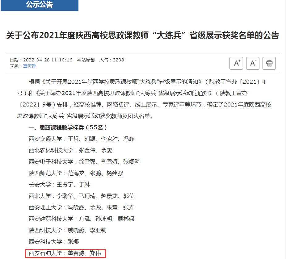 2021年度陕西高校思政课教师“大练兵”省级展示活动获奖名单于4月28日公布,beat365马克思主义学院教师董春诗、郑伟获得思政课程教学标兵称号,张莉、王婉菲获得思政课教学团队标兵称号,孟晓蕾获得思政课程教学能手称号。