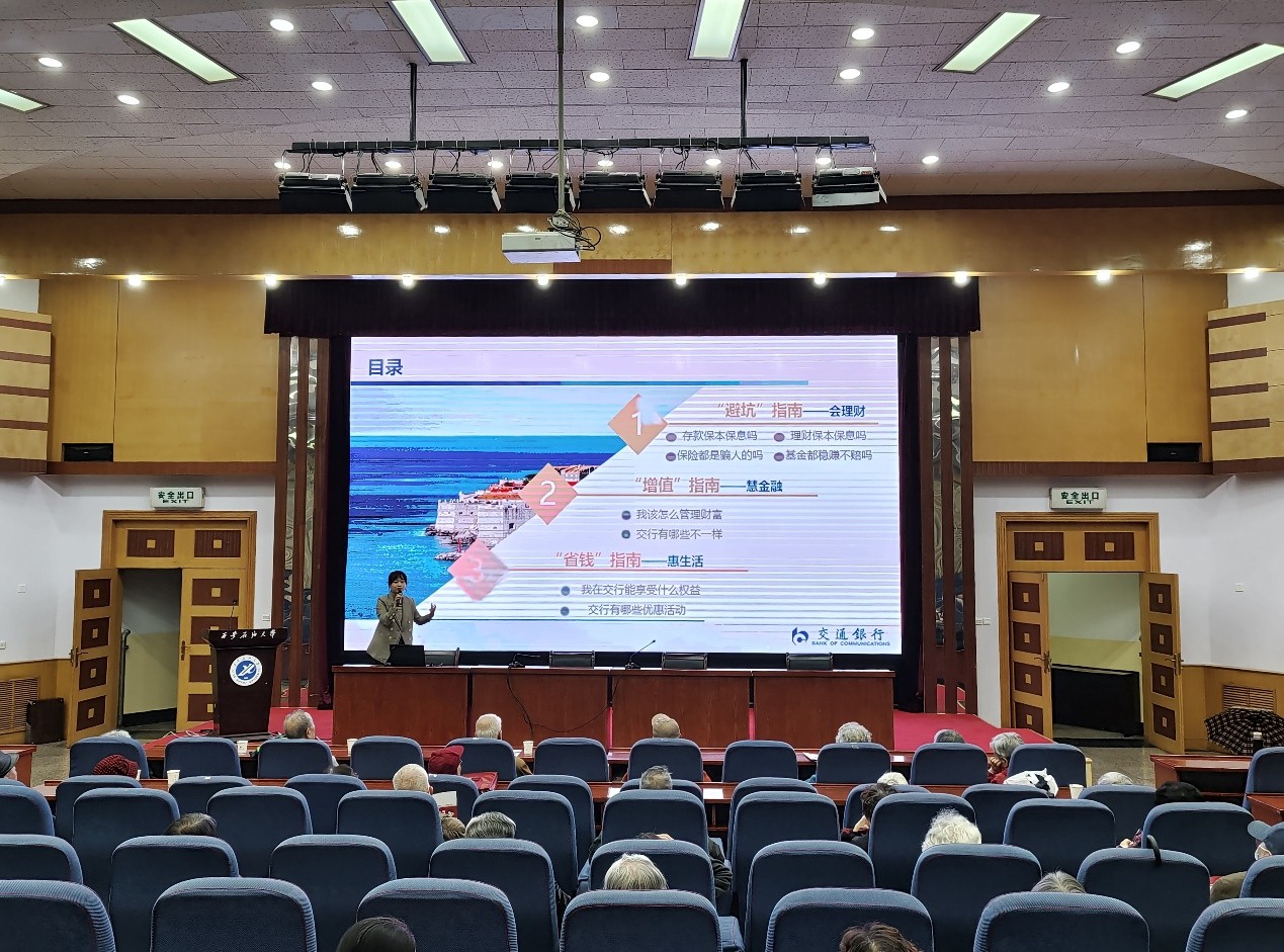10月15日下午,由离退休职工管理处、财务处共同举办的“金融服务进校园系列之一——离退休教职工金融知识讲座”活动,在beat365雁塔校区学术报告厅顺利召开。本次讲座邀请交通银行吉祥村支行行长梁婷、交通银行陕西省分行个人金融业务部业务专员冯雪婷担任主讲人。学校总会计师樊晓民出席,离退休职工管理处、财务处工作人员及100多名离退休教职工参加了讲座。