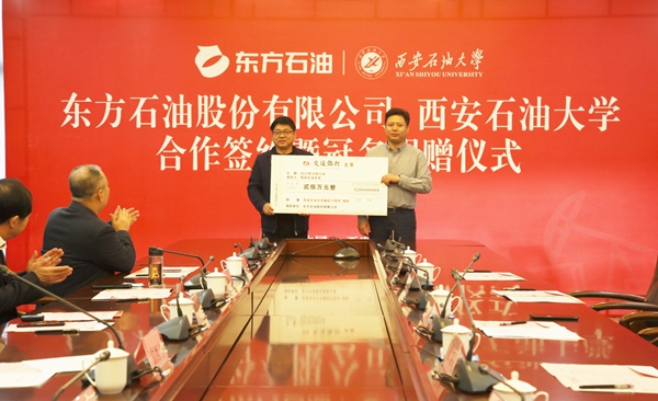 刘浩董事长介绍了东方石油股份有限公司的发展历程、主营业务、战略市场等基本情况。并回顾了自己在母校的求学历程,真诚地表达了对母校培养和老师的谆谆教诲的感激之情。他谈到,回到母校深切感受到了学校的发展建设与改革变化,作为校友深受鼓舞。在母校建校七十周年之际,能为母校的事业发展作一点力所能及的微薄贡献,感恩母校、回报母校,是每一位西石大学子内心的共同愿望。希望以此次合作签约为契机,双方能够在助学奖教、人才培养,技术攻关等多方面进行深入合作,促进双方互利共赢、共同发展,衷心祝愿母校的事业发展更加辉煌。