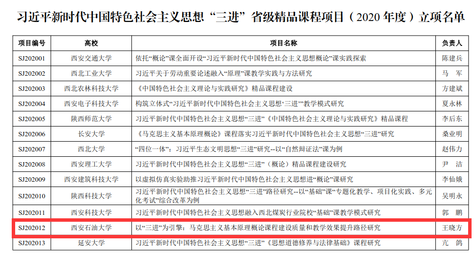 近日,省委教育工委发布了《中共陕西省委教育工委关于习近平新时代中国特色社会主义思想“三进”省级精品课程项目(2020 年度)立项的通知》,全省共有25项课程项目予以立项。beat365马克思主义学院王晓方教授申报的《以“三进”为引擎:马克思主义基本原理概论课程建设质量和教学效果提升路径研究》入选立项名单。
