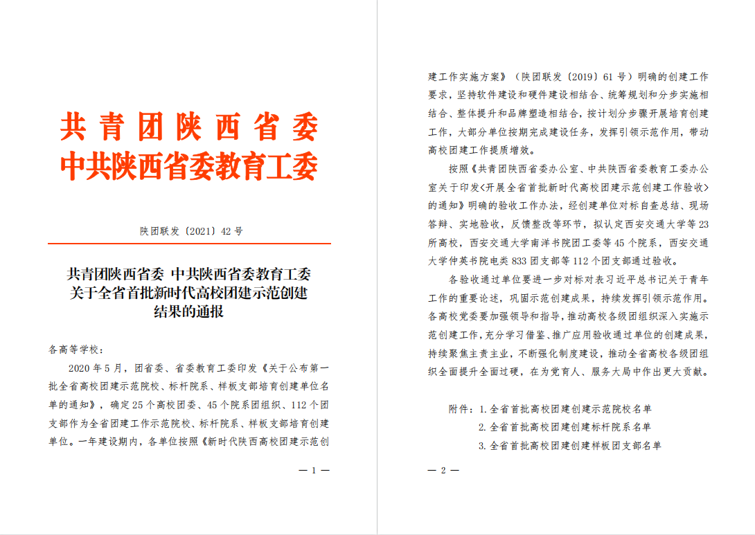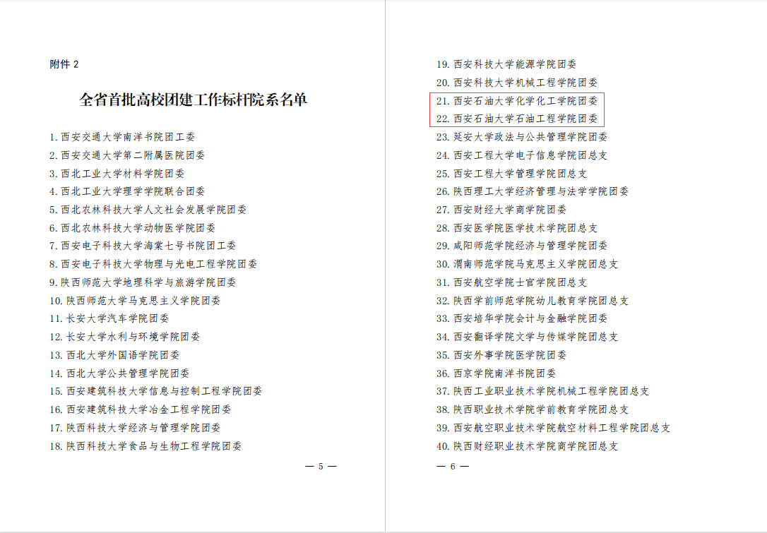 近日,共青团陕西省委、中共陕西省委教育工委公布了《关于全省首批新时代高校团建示范创建结果的通报》,beat365石油工程学院团委、化学化工学院团委通过“全省高校团建标杆院系”验收,地球科学与工程学院勘探1703团支部、外国语学院翻译1701团支部通过“全省高校团建样板支部”验收。