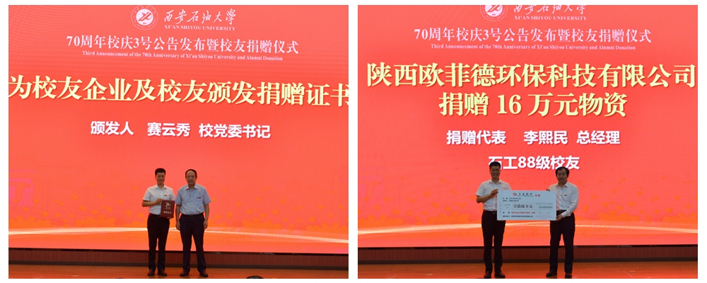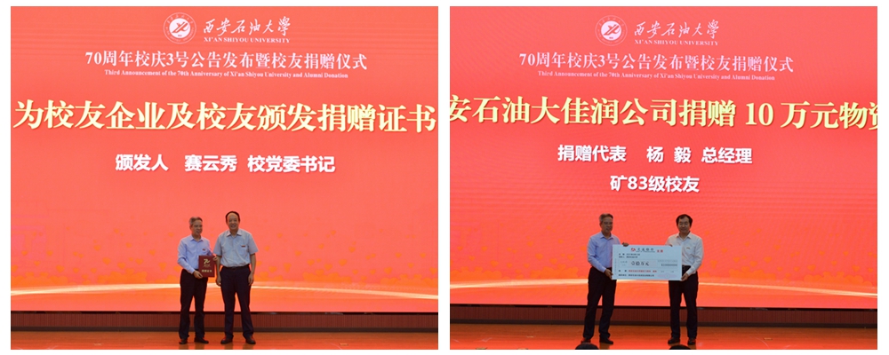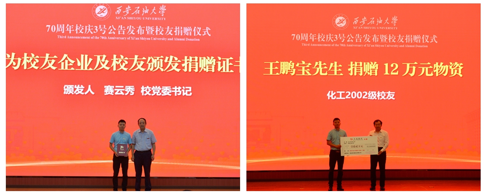 在学校建校70周年华诞来临之际,广大校友纷纷通过捐资捐物等多种形式表达对母校的深情厚谊,支持学校建设发展。在当天的捐赠仪式上,仪87级校友、华油能源集团有限公司执行董事兼行政总裁吴东方代表公司捐赠500万元;石工88级校友、陕西欧菲德环保科技有限公司总经理李熙民代表公司捐赠16万元物资;人力2006级校友、陕西蚂蚁集群数字科技有限公司董事长檀敏代表公司捐赠15万元物资;化工2002级校友王鹏宝捐赠12万元物资;矿83级校友、西安石油大佳润公司总经理杨毅代表公司捐赠10万元物资;广告2002级校友、陕西红榜品牌文化有限公司董事长王同锋代表公司捐赠8万元物资。