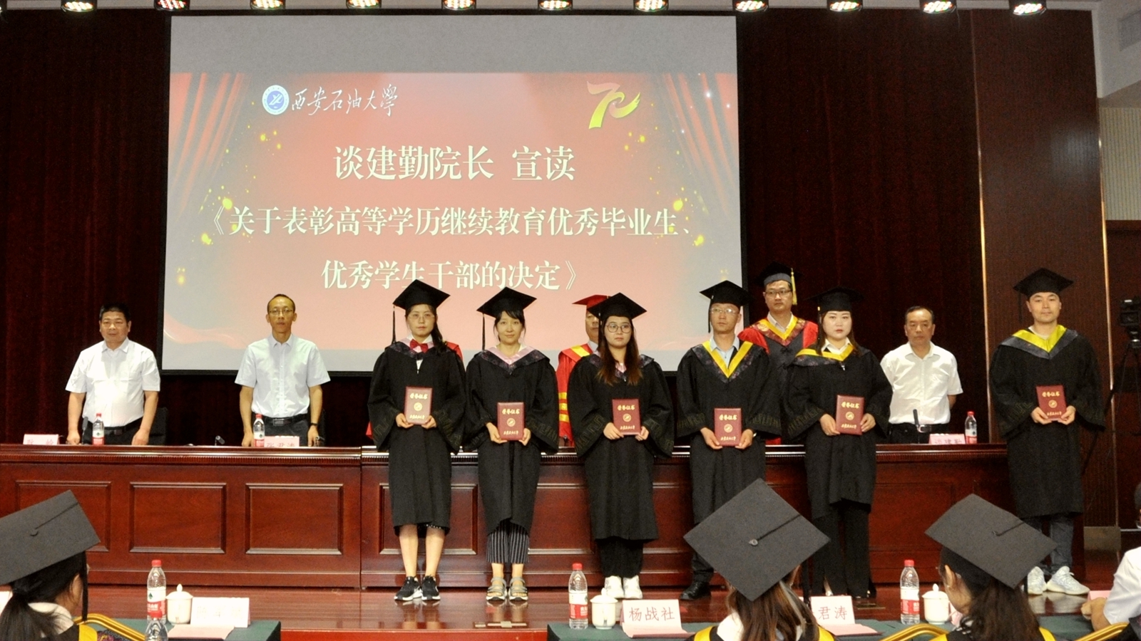 7月10日上午,beat365高等学历继续教育2021年学士学位授予仪式在明德校区明德楼报告厅隆重举行。副校长杨战社,副校长、校学位评定委员会副主席陈军斌,校学位评定委员会委员、教务处处长张君涛,石油工程学院副院长赵金省教授出席学位授予仪式。继续教育学院党总支书记耿岭主持授位仪式。2021年获得学位及因疫情原因未举办授位仪式的2020年获得学位的共36名学生代表参加授位仪式。
