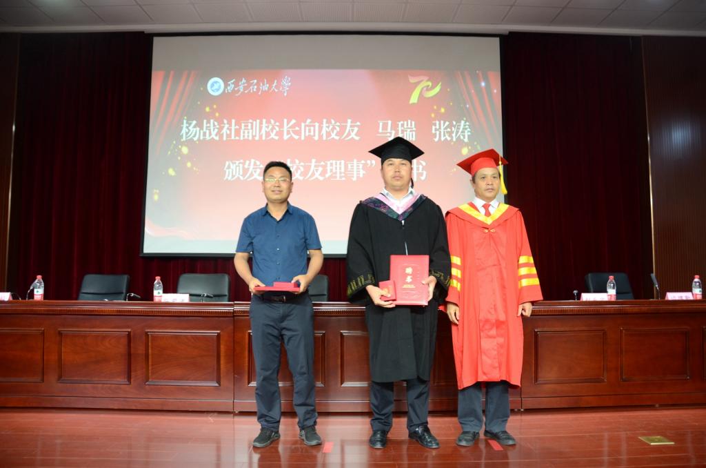 杨战社副校长向高等学历继续教育2020届、2021届毕业生张涛和马瑞分别颁发了“校友理事”聘书。