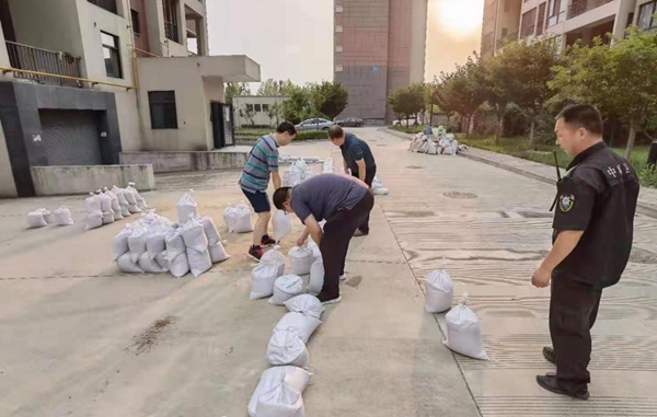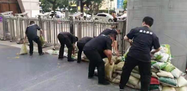 7月9日16:30—20:40 ,保卫处干部队员齐上手,在地势低洼部位堆垒沙袋。