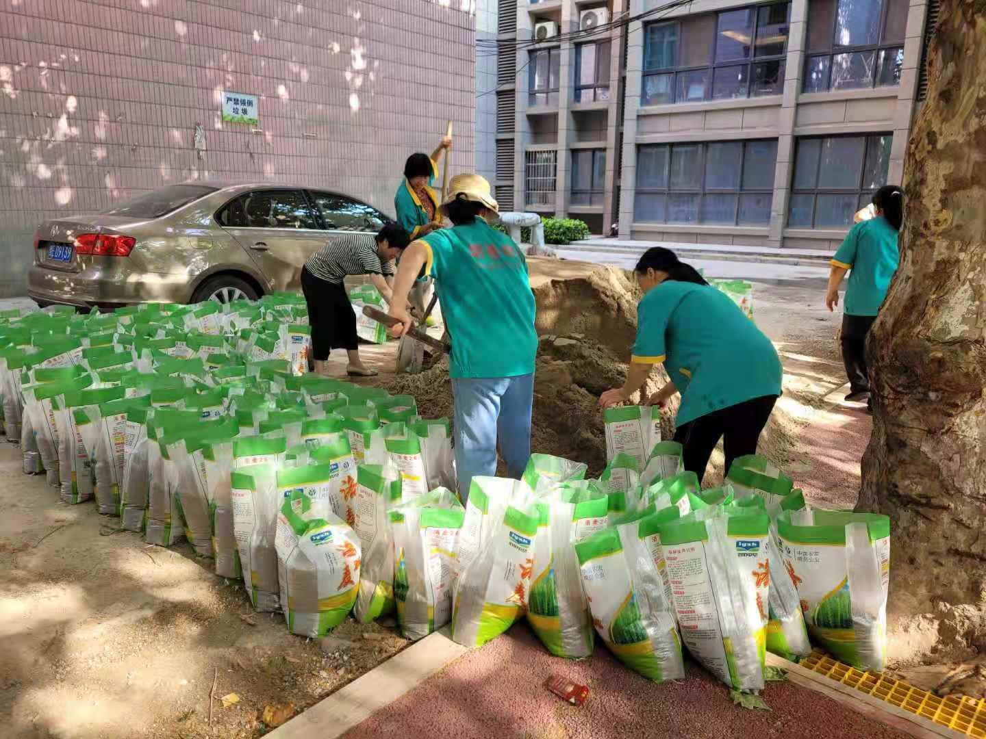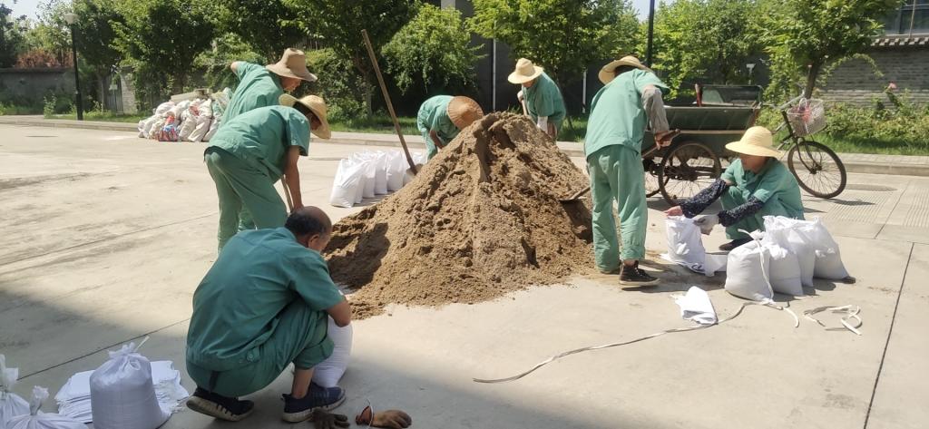 物业人员检查、装填防汛沙袋