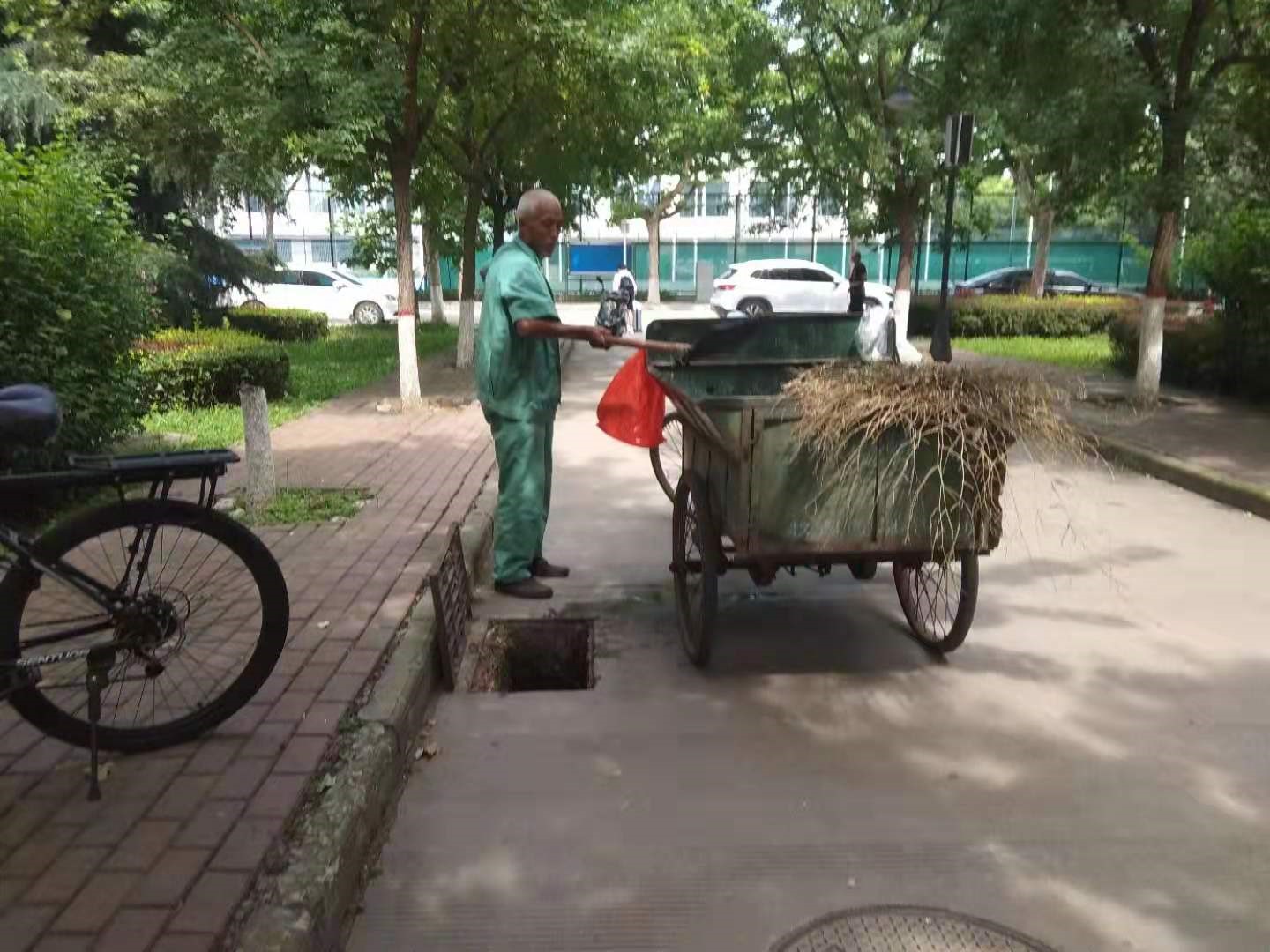 物业工作人员清理校园雨水收水井和排水沟内杂物