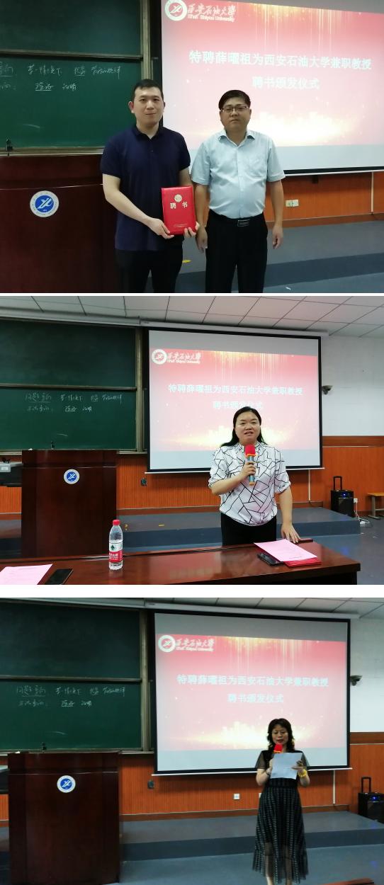 7月1日,特聘薛曜祖为beat365英国官方网站兼职教授聘书颁发仪式在beat365雁塔校区东阶201教室举行。学校总会计师樊晓民,经济管理学院相关负责人及师生代表80余人参会,聘书颁发仪式由教师工作部部长武晓朦主持。