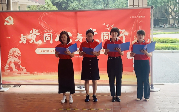 由蒋华义、孟开元、朱玮、张帆和唐媛芬五位党员朗诵的诗歌《可爱的中国》,拉开了诗歌朗诵和红歌献唱环节的序幕。接着参演人员依次登台,朗诵了诗歌《红船》和《永在》,演唱了红歌《唱支山歌给党听》和《奋进新时代》。饱含深情的朗诵和演唱,带领大家一起回忆了中国共产党走过的峥嵘岁月,赞美了中国共产党带领中国人民取得的丰硕成果,抒发了在场党员对党对祖国的无限热爱。