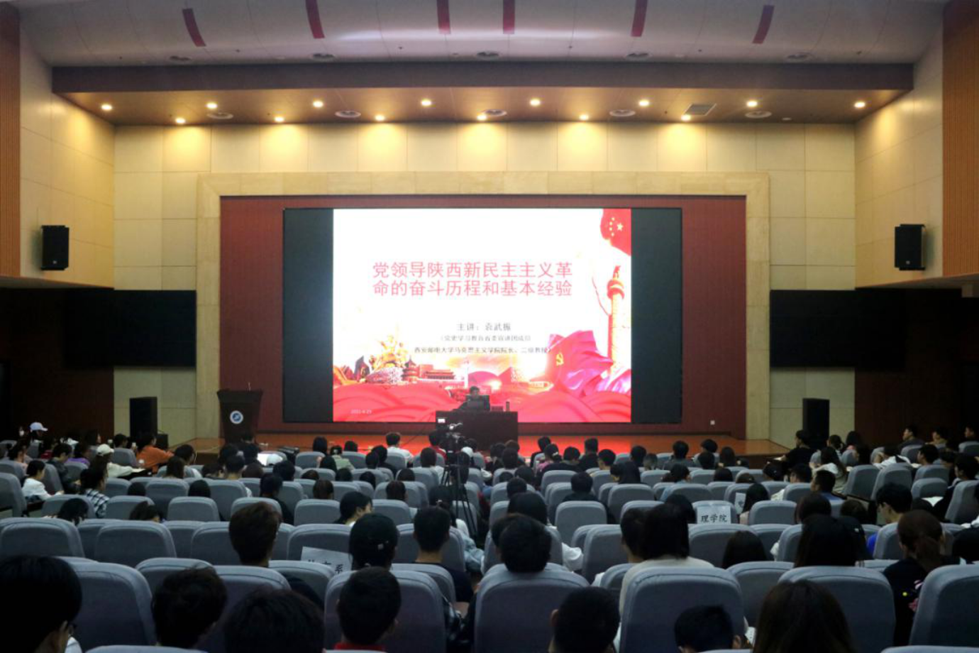 袁武振教授从“为什么学?学什么?怎样学?”出发,围绕深入学习领会习近平总书记关于党的历史的重要论述,阐释了党史学习教育的重大意义。随后,袁教授从中共党组织在陕西的建立、陕西党组织在革命洪流中的发展成长、陕西党组织掀起土地革命风暴、全民族抗战中的陕西党组织、夺取新民主主义革命的全面胜利、党领导陕西新民主主义革命胜利的基本经验等六个方面,通过详实的史料、精辟的语言,生动再现、系统梳理了陕西新民主主义革命时期党的历史,为在座的师生深刻认识党的百年奋斗史开阔了视野,廓清了迷雾,提供了借鉴。袁教授的报告主题鲜明、立意深刻,使大家进一步明确了学习党史的目的,坚定了听党话、跟党走的信念和决心。