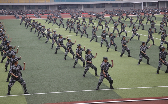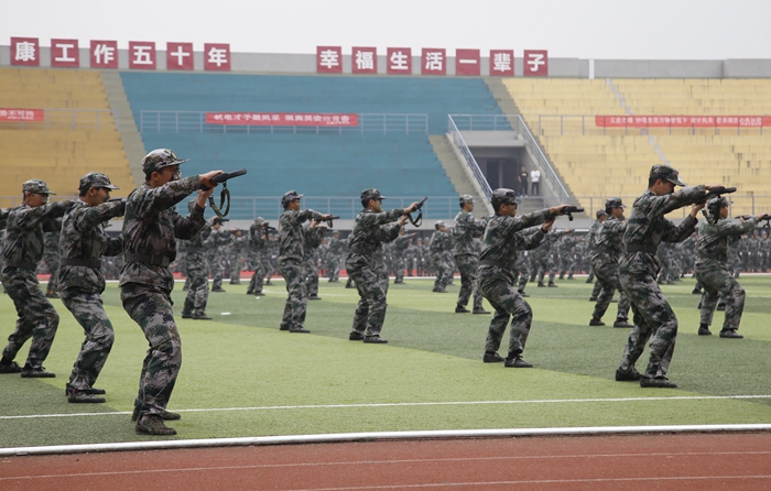 伴随着激昂的进行曲和嘹亮的口号,2020级本科生分12个方阵,迈着整齐矫健的步伐,精神饱满地经过主席台,向全校师生展示队列训练成果。队列成果展示后,2020级本科新生分别进行了捕俘刀、军体拳、刺杀操、手语操等科目的表演。
