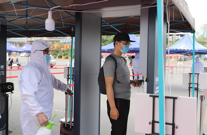 返校当天,所有同学在现场工作人员的指引下,依次有序完成了更换口罩、测量体温、行李消毒、健康码核查、身份核实等流程。