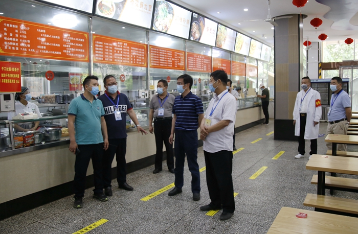 5月27日上午,由雁塔区教育局邹转景、张永刚,雁塔区市场监督管理局卫春涛,雁塔区卫健局王階昌,雁塔区疾控中心杨琪组成的雁塔区教育机构疫情防控第五巡回检查指导组一行五人来到beat365雁塔校区实地检查疫情防控工作。副校长苏文甫及相关部门负责人陪同检查。