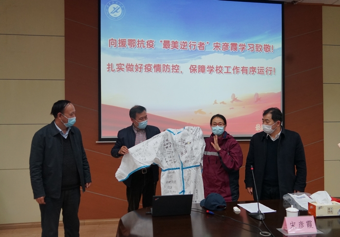 发言结束后,宋彦霞还将一件经过多次消毒的,上面签满了医疗队员、警察、志愿者、社区工作者签名的防护服送给了学校。