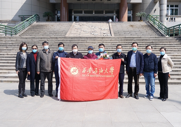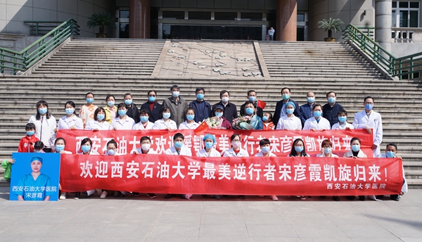 4月8日上午,宋彦霞护士结束了14天的隔离观察期,从隔离观察点返回学校。校党政领导李天太、张木、苏文甫,相关部门负责人及校医院部分职工在雁塔校区东门迎接宋彦霞护士。