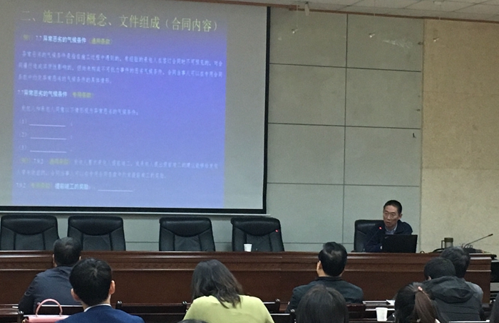 专题讲座上,徐雷教授围绕建筑工程合同管理中的合同概述、施工合同概念文件组成、施工合同的特点、施工合同风险识别障碍、施工合同索赔问题以及施工合同管理方法建议等六个方面,进行了详细地讲解。讲座中穿插了大量的实际案例,具有较强的针对性和实践性。讲座结束后与会人员积极向徐教授提问请教,现场气氛热烈。