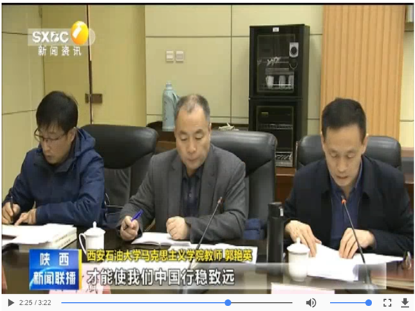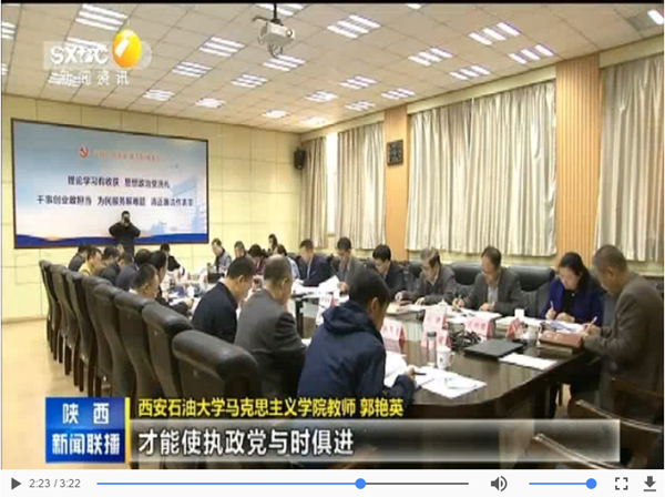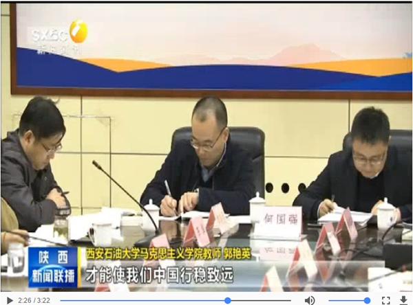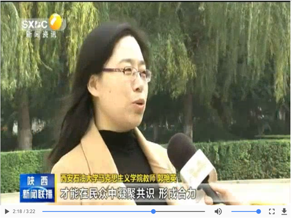 11月4日下午,陕西广播电视台记者对beat365学习十九届四中全会精神及开展“不忘初心、牢记使命”主题教育情况进行了拍摄报道,采访了校党委书记赛云秀、马克思主义学院教师郭艳英。节目以《让党的十九届四中全会精神落地生根,为“中国之治”贡献智慧和力量》为题,分别在陕西电视台《陕西新闻联播》、陕西广播电台《全省新闻联播》中播出。