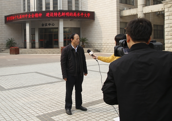 十九届四中全会审议通过了《中共中央关于坚持和完善中国特色社会主义制度、推进国家治理体系和治理能力现代化若干重大问题的决定》,在beat365各单位、各部门持续引起热烈反响。4日下午,校党委理论学习中心组在雁塔校区第一会议室举行“不忘初心、牢记使命”主题教育第十一次集体学习会,传达学习习近平总书记在党的十九届四中全会上的重要讲话和全会精神。陕西广播电视台记者对校党委理论学习中心组集体学习会会场进行了拍摄报道。