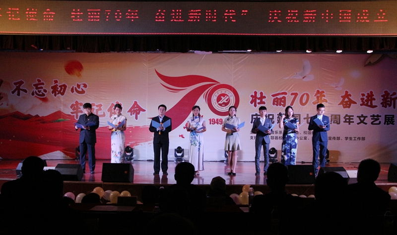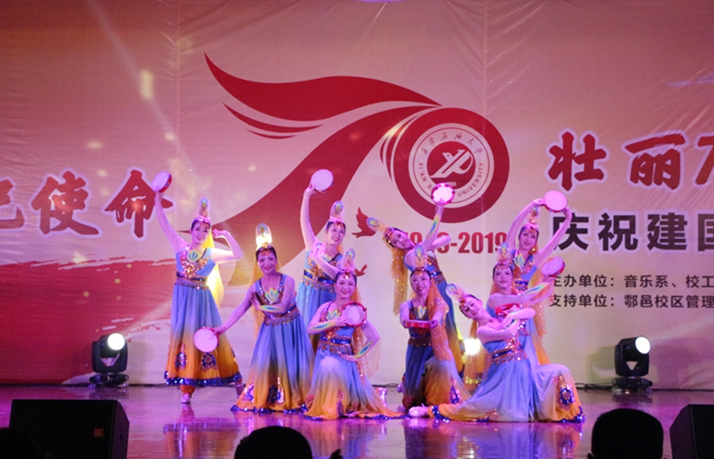 为深入开展“不忘初心、牢记使命”主题教育,10月26日晚,由音乐系、校工会、校团委主办,鄠邑校区管理办公室、组织部、宣传部、学生工作部支持的“不忘初心、牢记使命,壮丽70年、奋进新时代”庆祝新中国成立七十周年文艺展演在鄠邑校区腾辉大学生活动中心举行。校党委副书记雷西合、副校长杨战社、副校长程永清出席活动。相关部门负责人及鄠邑校区600余名学生观看了晚会。