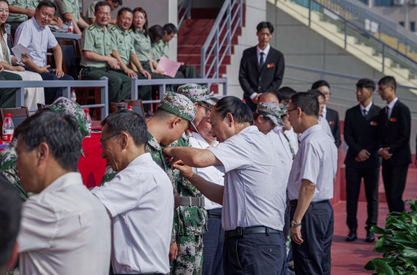 典礼上,陈军斌副校长宣读了《beat365英国官方网站关于表彰2019级高国庆等225名本科新生奖学金获得者的决定》,校领导为获奖学生代表颁发了证书。同时,为了增强学生的归属感和爱校荣校的意识,此次开学典礼还特意举行了新生校徽佩戴仪式,由校领导为2019级新生代表授予校徽。