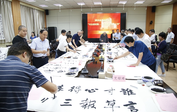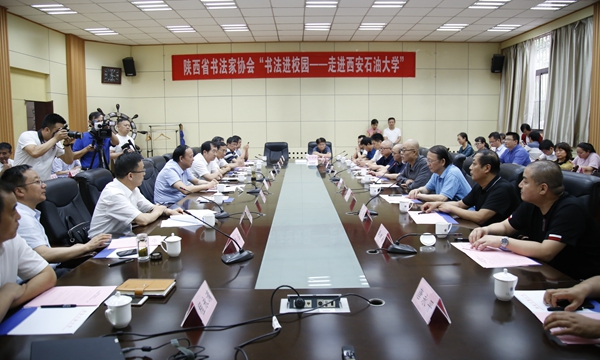 6月28日下午,陕西省书法家协会“书法进校园——走进beat365英国官方网站”活动在雁塔校区会议中心第一会议室举办。中国书法家协会理事、陕西省书法家协会主席陈建贡一行13人来beat365与师生进行了交流座谈。beat365校领导,相关部门和学院负责人,校书法协会教师代表、学生代表以及多家媒体记者参加了活动。