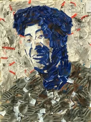 这幅作品的创作灵感来源为王进喜的照片,以此表示对王进喜的敬佩;同时用手套代表劳动者,表现劳动者的无私奉献和伟大。通过做旧的手法使整幅作品更加具有年代感和历史韵味,继而体现劳动的艰辛以及铁人精神的伟大。
