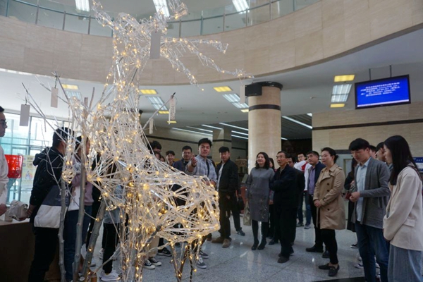 本届《公共艺术设计》课程作品展以“启迪思想、陶冶人生”为主题,展出由人文学院设计系张瑞平教师指导2016级环境设计专业学生完成的课程实践作品。共展出31组室内外公共艺术设计作品,由装置艺术、浮雕、综合材料艺术等类型组成,分布在鄠邑校区二楼图书馆及图书馆周边花园、草坪等相关区域。