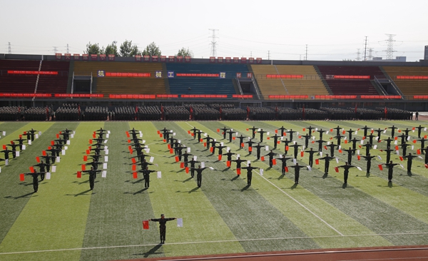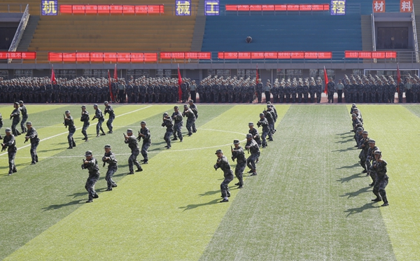 开学典礼暨军训汇报会在激昂的国歌声中拉开了序幕。伴随着嘹亮的口号,2018级新生们在各院(系)辅导员的带领下迈着整齐矫健的步伐,精神饱满地经过主席台,接受校领导的检阅。新生们还进行了军体拳、刺杀操、捕俘刀、旗语指挥等科目的表演。