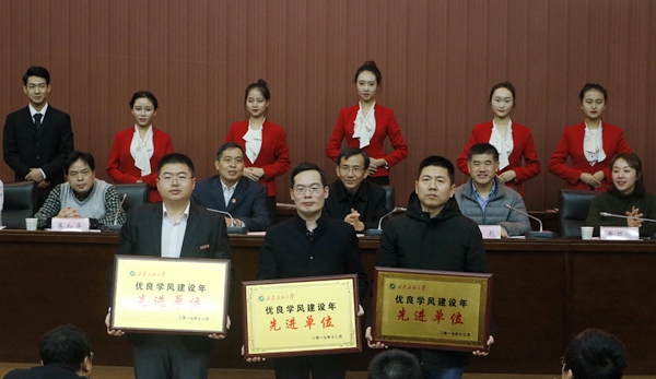 会上表彰了2016-2017年学风建设年先进单位、国家奖学金获得者、中国石油奖学金获得者、优良学风班、先进班集体、主题班团会优秀班级、素质拓展优秀团队、三好学生、优秀学生干部、文明宿舍、标兵宿舍等先进集体和个人。石油工程学院党委副书记张建高代表学风建设年先进单位作了经验交流发言。计算机学院通信1502班王胤禛、经济管理学院ACA1602班曹璋颖两位同学分别代表先进集体和先进个人作了发言。