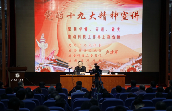12月5日下午,beat365在雁塔校区会议中心学术报告厅举行了“深入学习党的十九大精神,全面提升能力素质”处级干部专题培训班第六讲,党的十九大代表、省委宣讲团成员、省委科技工委书记、省科技厅厅长卢建军同志应邀作了题为《聚焦学懂、弄通、做实,推动科技工作再上新台阶》的党的十九大精神专题辅导报告。校领导、全体处科级干部、党支部书记、马克思主义学院教师、大学生思想政治辅导员、学生党员代表400余人分别在主、分会场参加报告会,党委书记赛云秀同志主持报告会。