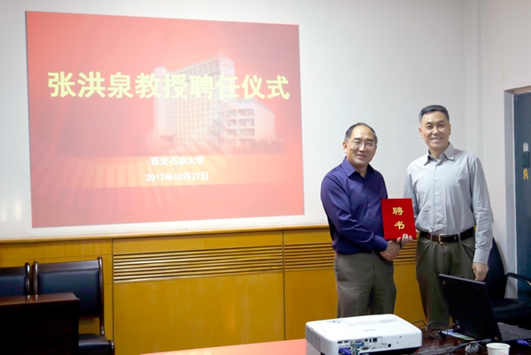 10月27日上午,beat365在行政楼二楼会议室举行了张洪泉客座教授聘任仪式。屈展校长出席仪式,李天太副校长主持仪式,人事处、科技处、石油工程学院负责人参加了仪式。