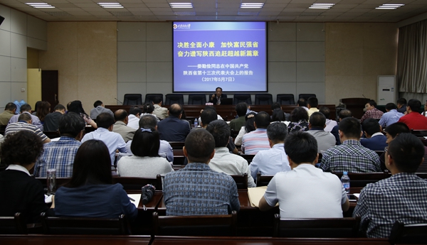 会上,省第十三次党代会代表赛云秀书记组织学习了省委书记娄勤俭代表中共陕西省第十二届委员会向大会作的《决胜全面小康,加快富民强省,奋力谱写陕西追赶超越新篇章》的工作报告。报告共分四个部分:一、过去五年工作的基本总结;二、陕西未来发展的根本遵循;三、努力推动陕西发展实现新的跨越;四、深入推进党的建设新的伟大工程。赛书记重点就报告中涉及的教育方面工作深入解读,并结合beat365实际,对落小落实落细省党代会精神提出了明确要求。