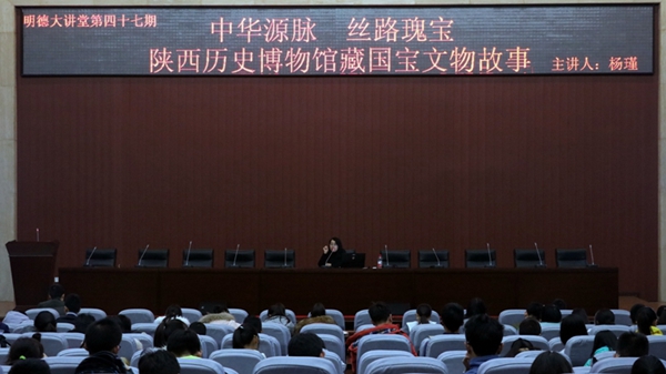 12月14日晚,由合作发展处、校团委共同主办的第47期明德大讲堂之《中华源脉 丝路瑰宝——陕西历史博物馆藏国宝文物故事》在新校区图书馆弘石学术报告厅举办。陕西历史博物馆科研管理处处长、中共陕西省委宣传部理论讲师团特聘专家杨瑾老师担任主讲,新校区近四百余名学生听取了讲座。